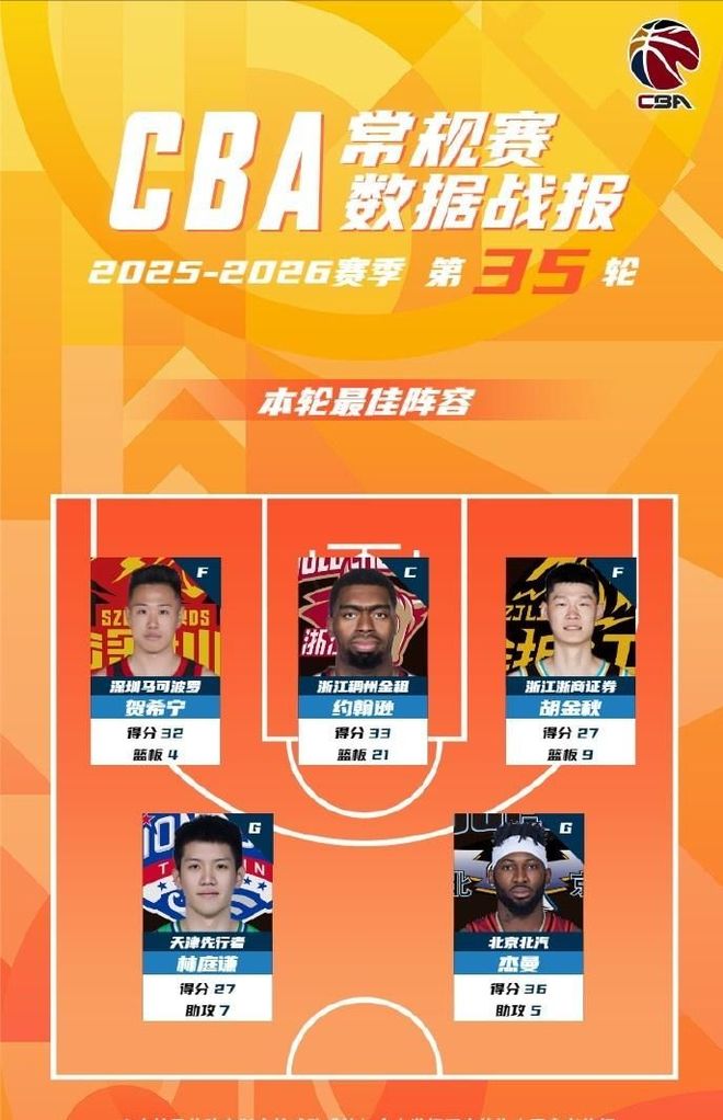 深圳队贺希宁、浙江队约翰逊、广厦队胡金秋、天津队林庭谦以及北京队杰曼,近几轮频频打出高光表现,名字频频跃上技术统计榜首。